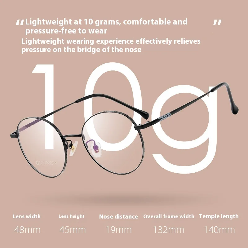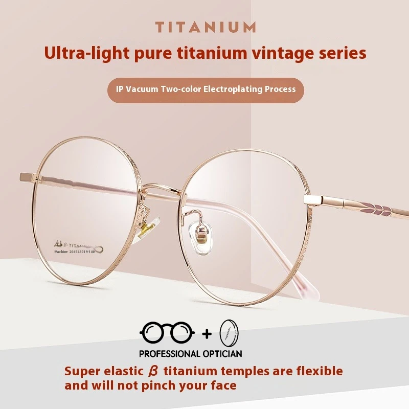 Frame Material: Pure TitaniumnFrame Style: RoundnLens Material: PolycarbonatenLens Function: Blue Light BlockingnGender: WomennPrescription Support: Yesnnn|Light Titanium Round Frame Women S Glasses|Light Titanium Round Frame Women S Glasses Blue Light|Light Titanium Round Frame Women S Glasses Blue Light Blocking|nn**Elegant Design Meets Functionality**nDiscover the perfect blend of style and functionality with our Fashion Retro Style Round Ultra-light Pure Titanium Full Small Blue Light Prescription Glasses. Designed exclusively for women, these glasses boast a chic round frame that complements any face shape, making them a versatile addition to your wardrobe. The ultra-light pure titanium material ensures lasting comfort, while the full frame design offers comprehensive coverage, making it ideal for those who spend long hours in front of digital screens.nn**Optimal Vision Clarity**nOur lenses are crafted from high-quality polycarbonate, offering exceptional clarity and durability. The blue light blocking feature is designed to reduce eye strain and fatigue, making it perfect for those who spend hours working on computers, tablets, or smartphones. Whether you're a professional, student, or simply someone who values their eye health, these glasses are the perfect solution for reducing digital eye strain.nn**Customization and Convenience**nUnderstanding that every prescription is unique, our glasses are tailored to support a range of prescriptions, including those with astigmatism. The default lenses are non-spherical blue light blocking lenses, but we offer a variety of lens options to suit your specific needs. Simply inform our customer service of your prescription information to ensure a perfect fit, and enjoy the convenience of a product that's designed just for you. With our light titanium round frame women's glasses, you can experience the perfect blend of style, comfort, and vision clarity.