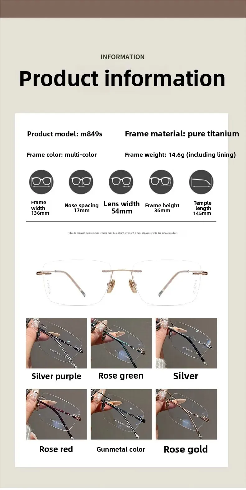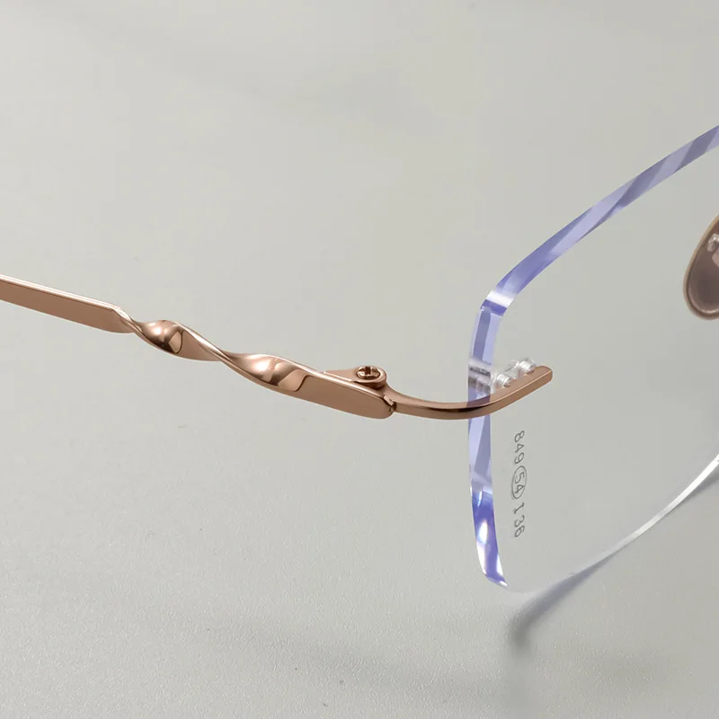 Lens Material: PlasticnItem Number: M849nGlasses Structure: Framelessn3分贝带宽: M849nLens Function: No special featuresnGlasses Style: BoxnWhether to Support Myopia Glasses: YesnSuitable for Face Shape: Square facenGender: WomennFrame Material: Pure TitaniumnLens Material: Polycarbonaten105℃挥发物≤: DIKELANGnApplicable Population: General purposenStyle Classification: Personality trendnnn|Rimless Titanium Glasses|Titanium Rimless Frameless Glasses|nn**Unmatched Comfort and Style**nExperience the ultimate blend of comfort and style with our Ultra-light Pure Titanium Rimless Spectacle Frames. Designed for both men and women, these frameless glasses are the epitome of contemporary fashion. Made from pure titanium, these glasses offer unparalleled durability and lightness, ensuring you can wear them comfortably throughout the day. Their frameless design gives you a clear view of your eyes, making them a perfect choice for those who want to make a bold fashion statement.nn**Versatile and Adaptable**nThese titanium rimless glasses are not just about looks; they cater to a wide range of scenarios. Whether you're at work, enjoying leisure time, or engaging in sports activities, these glasses are your perfect companion. They are designed to support myopia glasses, making them versatile for various eye conditions. Their general-purpose appeal ensures that they can be worn by a wide audience, making them a popular choice for all.nn**Adaptable to Your Face Shape**nUnderstanding that every face is unique, our Ultra-light Pure Titanium Rimless Spectacle Frames are crafted to suit a square face shape. The box-style glasses structure adds a touch of elegance and sophistication, making them a perfect fit for those looking for a personalized trendy accessory. The lightweight nature of the glasses means they won't put any pressure on your face, ensuring comfort throughout the day. The lens material is plastic, providing a clear view without the added weight of special features.
